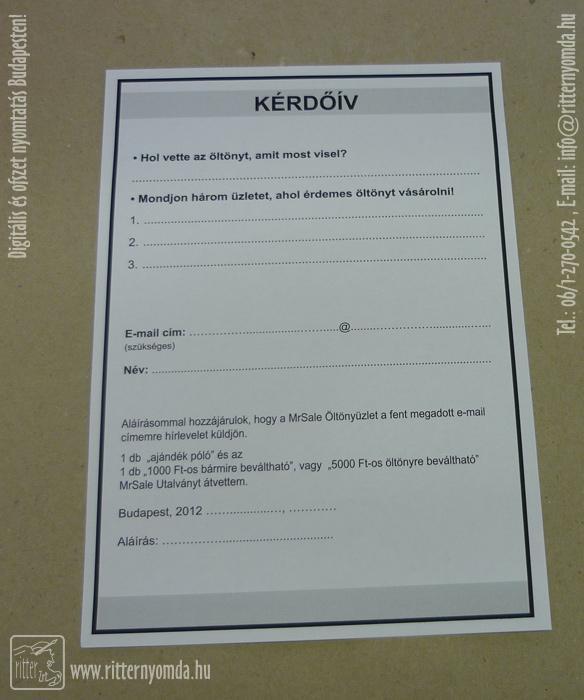 "Kérdőív, űrlap nyomatás" nyomdai referencia munka.
