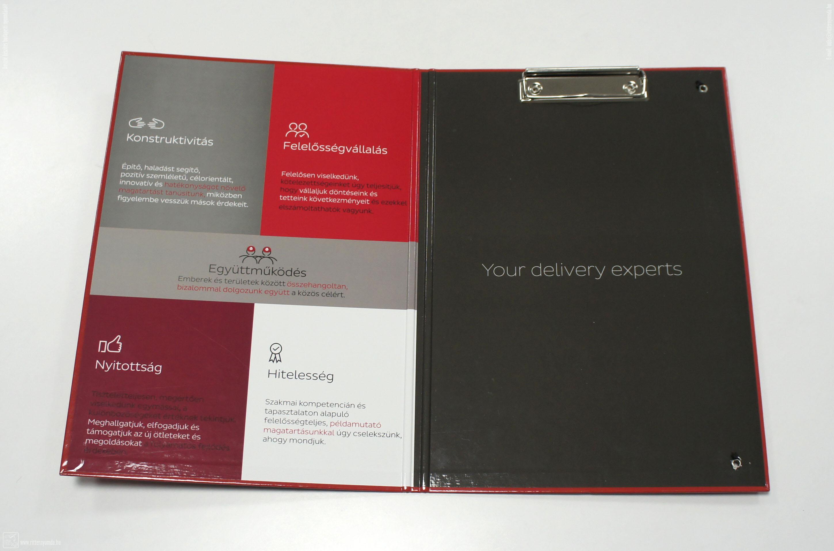 "Gyűrűs dosszié, stancolt mappa készítés" nyomdai referencia munka.