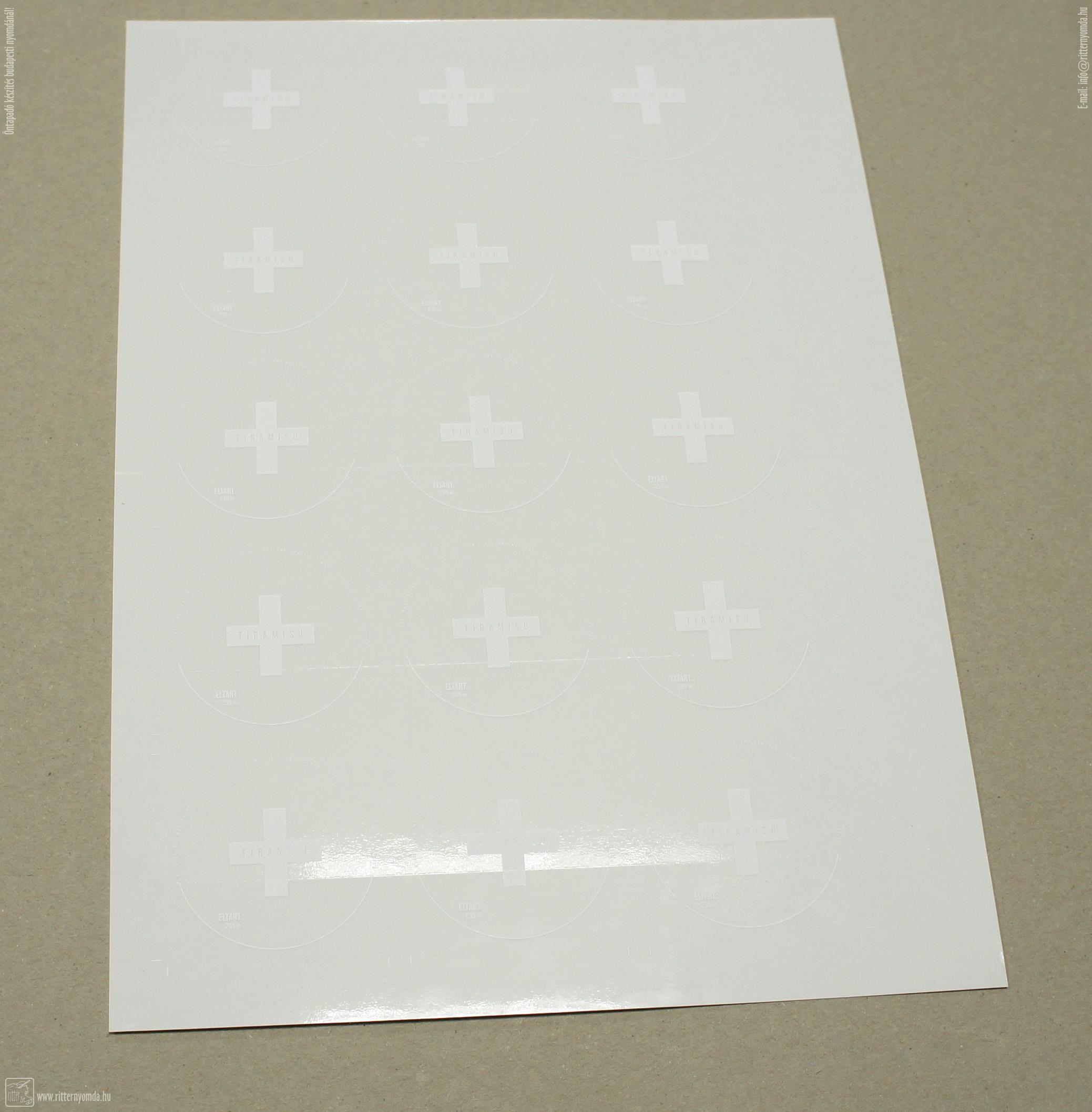 Szitanyomás, Matrica - matrica, fehér, háttban, ritzelve, sütemény, cukrászat, méretre, vágva, víztiszta, vinyl